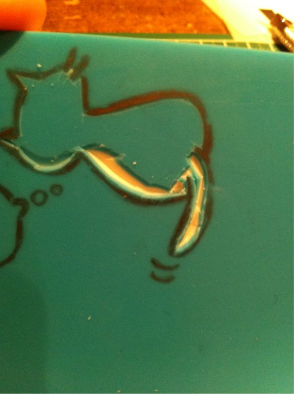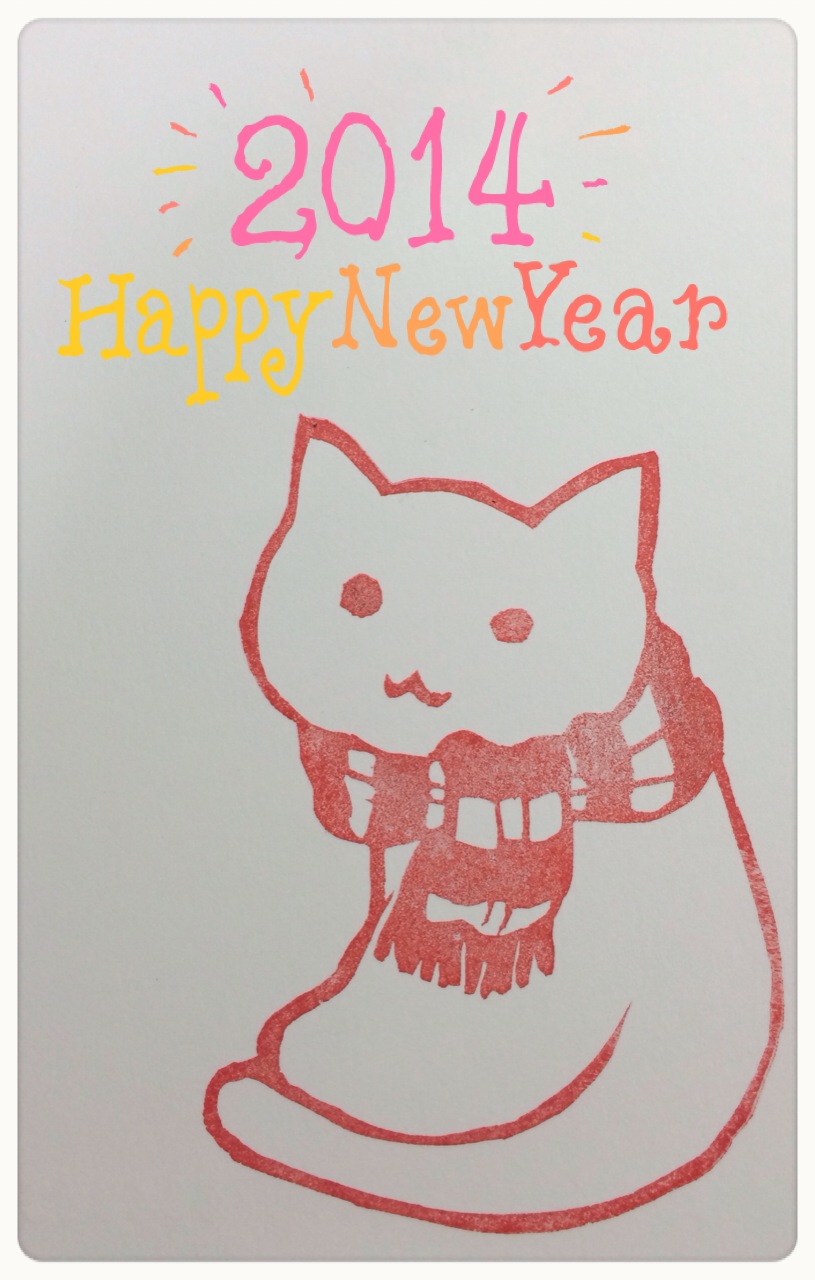 年賀状用に作った消しハン、マフラーまいた猫。ぬくぬくにゃーーー
